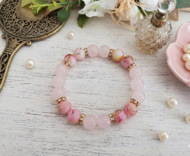 Bracelet perles en verre imitation jade rose pale et rose tréfilé