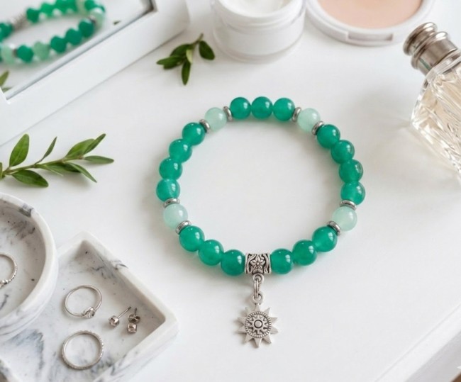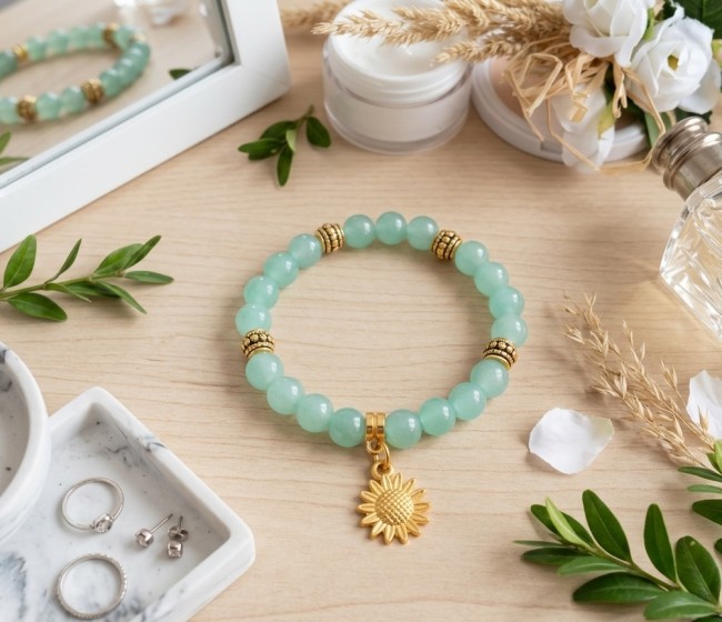Bracelet fil élastique et perles en verre vert d'eau avec breloque fleur de tournesol