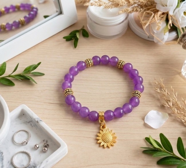Bracelet fil élastique et perles en verre violette avec breloque fleur de tournesol