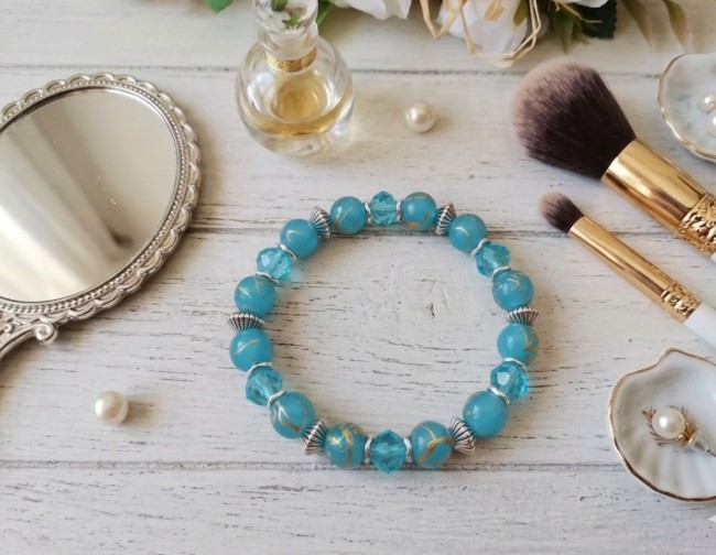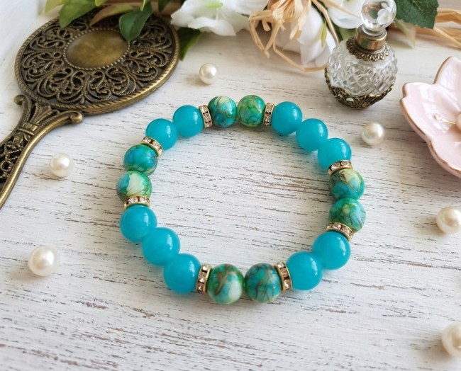 Bracelet perles en verre imitation jade turquoise et bleu vert tréfilé