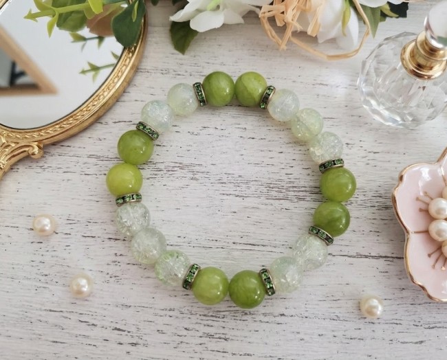 Bracelet fil élastique perles verre craquelé vert pale et jade verte