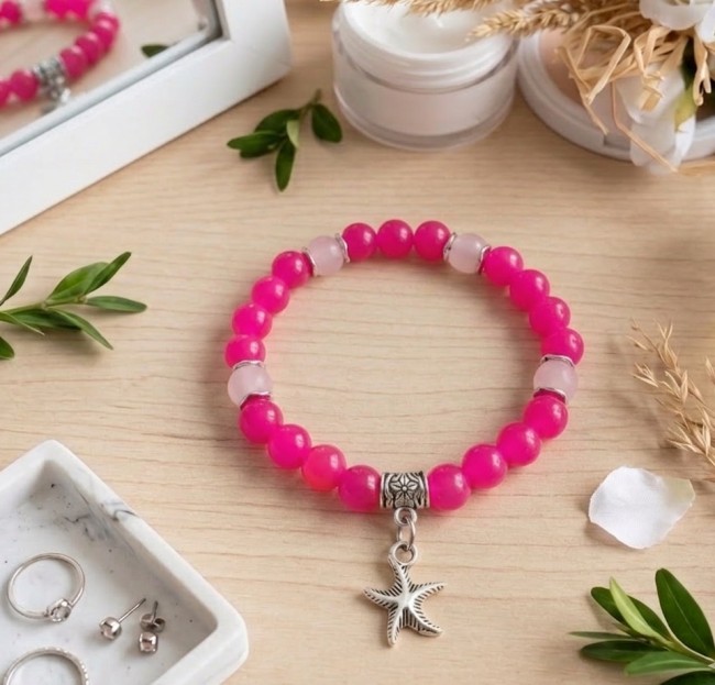 Bracelet fil élastique et perles en verre fuchsia avec breloque étoile de mer