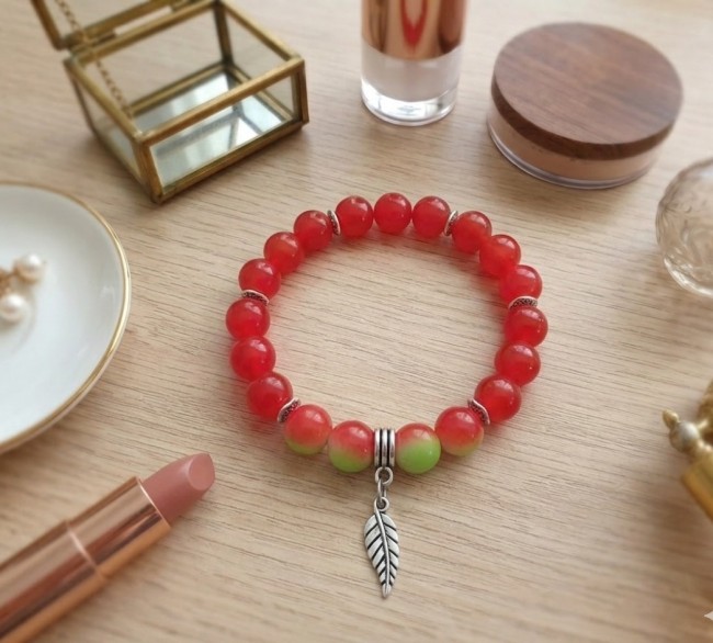Bracelet perles en verre imitation jade rouge et breloque feuille