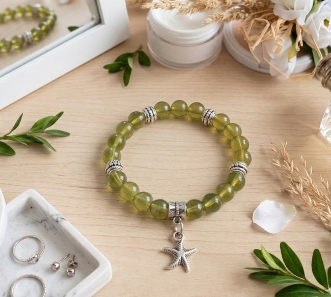 Bracelet fil élastique et perles en verre kaki avec breloque étoile de mer