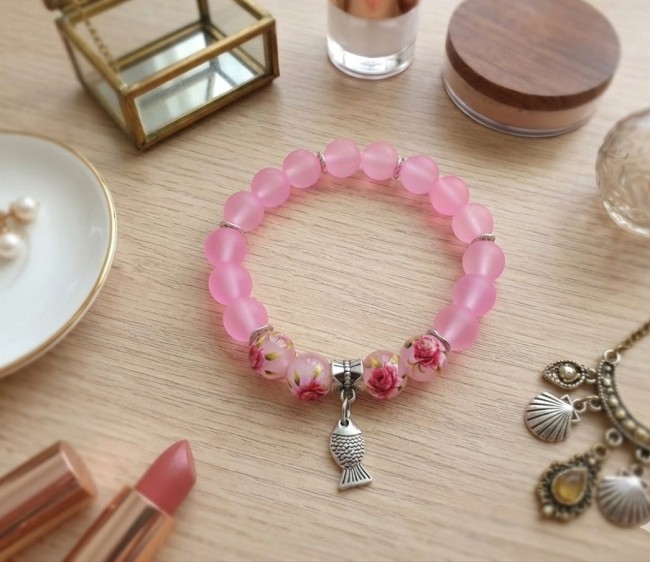 Bracelet perles en verre givré rose et breloque poisson