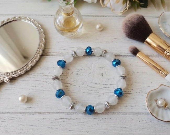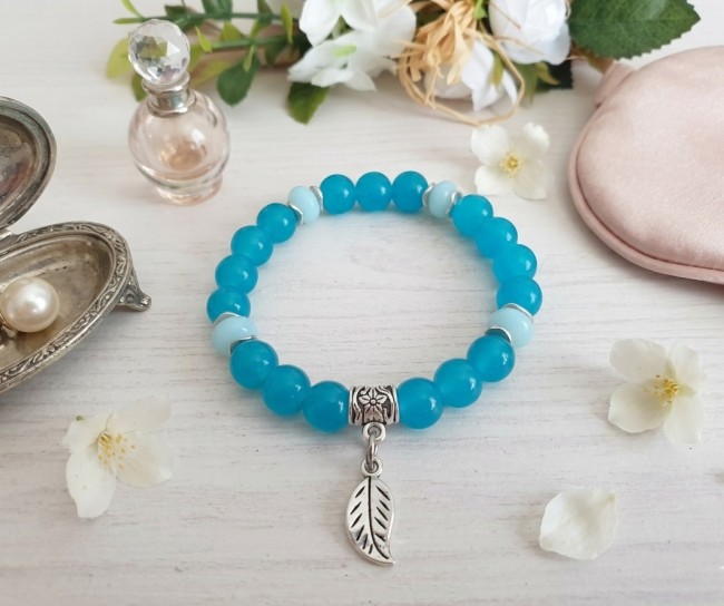 Bracelet fil élastique et perles en verre bleu avec breloque feuille