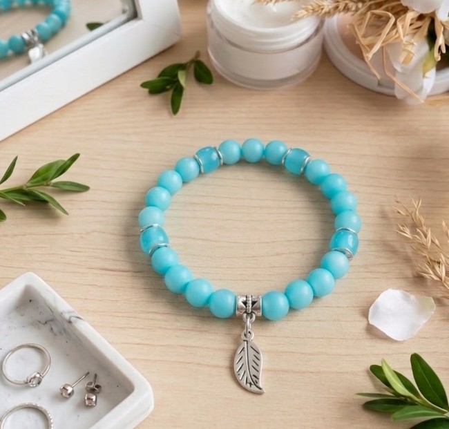 Bracelet fil élastique et perles en verre bleu clair avec breloque feuille