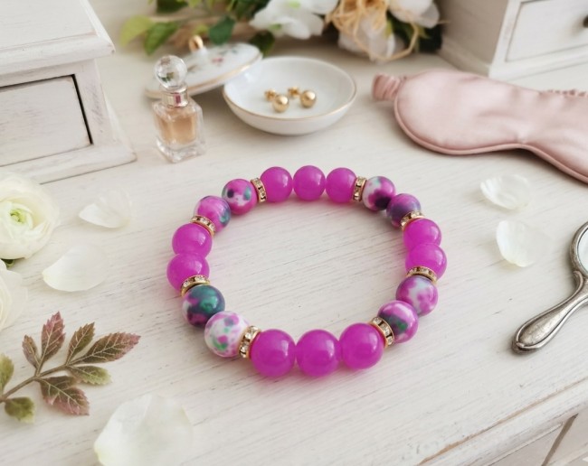 Bracelet fil élastique perles verre imitation jade et jade fuchsia avec taches
