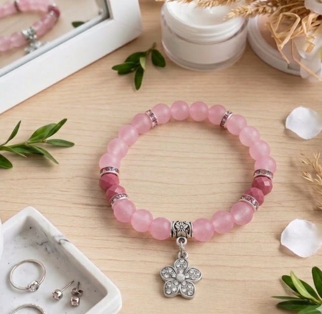 Bracelet fil élastique et perles en verre rose avec breloque fleur strass