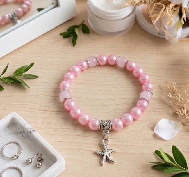Bracelet fil élastique et perles en verre rose nacré avec breloque étoile de mer