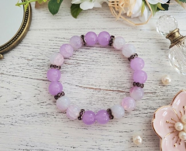 Bracelet perles en verre imitation jade lilas et mauve craquelé