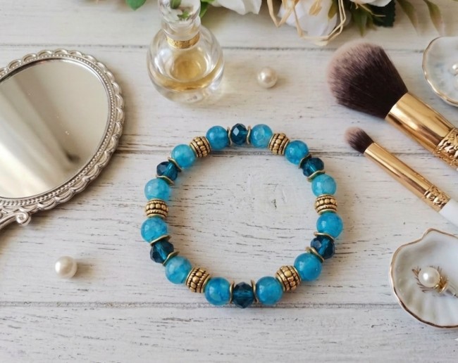 Bracelet fil élastique avec perles en verre bleues et apprêts dorés