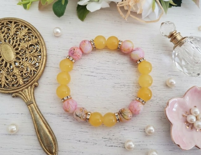 Bracelet perles en verre imitation jade jaune et rose tréfilé