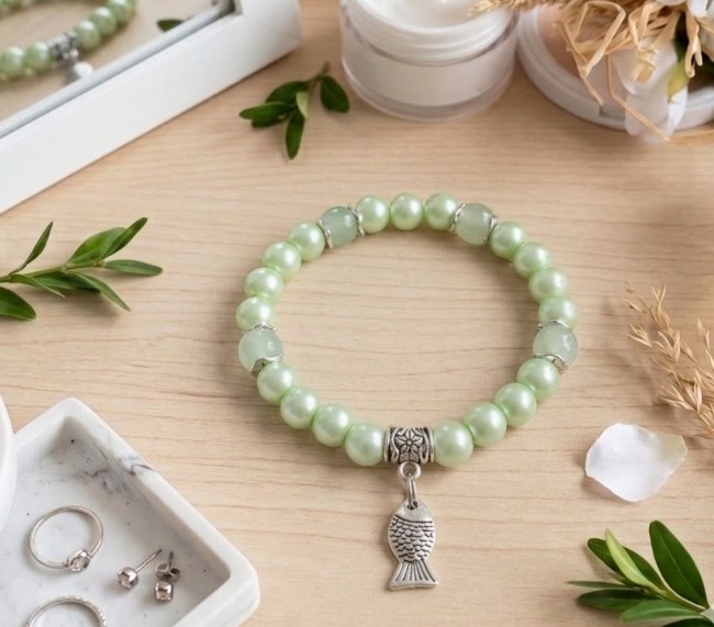 Bracelet fil élastique et perles en verre vert anis avec breloque poisson