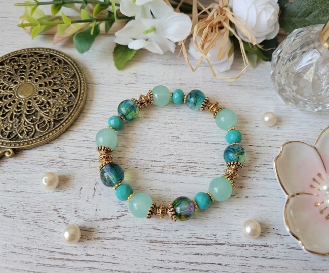Bracelet perles en verre imitation jade turquoise 10 mm et bleu vert tréfilé