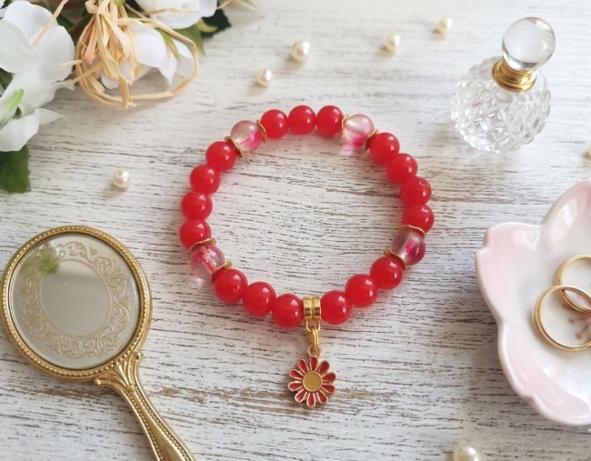 Bracelet fil élastique et perles en verre rouge et breloque fleur
