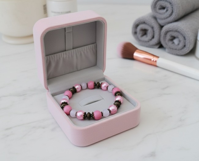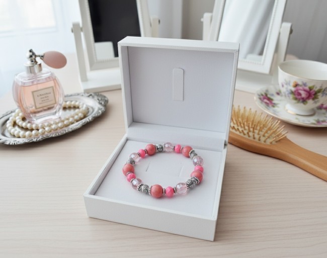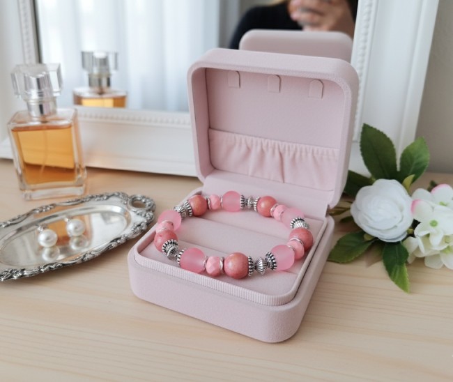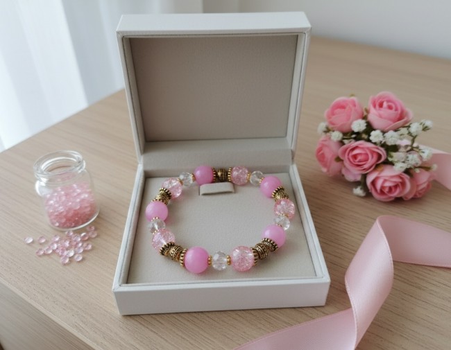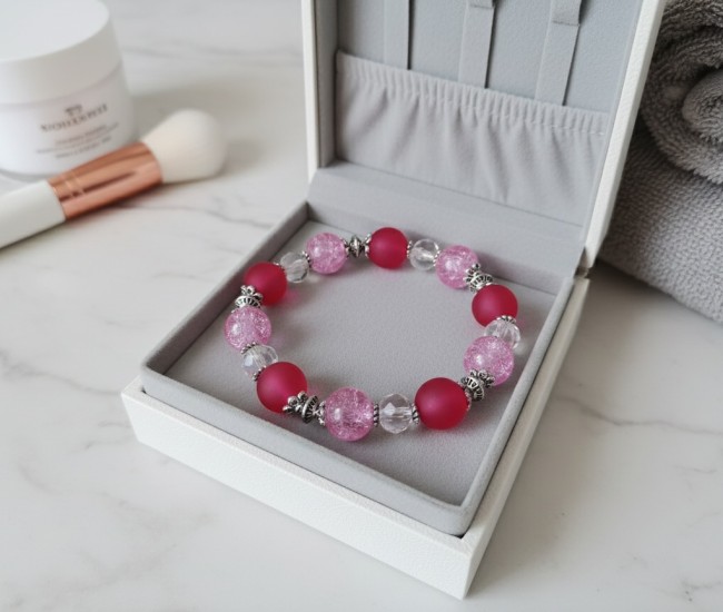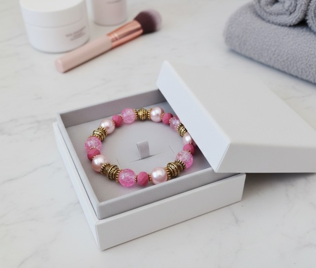 Bracelet fil élastique perles imitation jade et craquelé rose