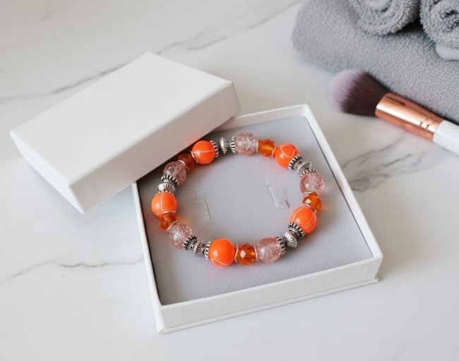 Bracelet fil élastique perles imitation jade et craquelé orange