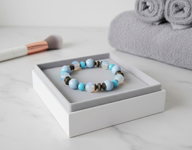 Bracelet fil élastique perles imitation jade et craquelé bleu ciel
