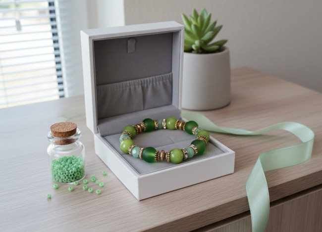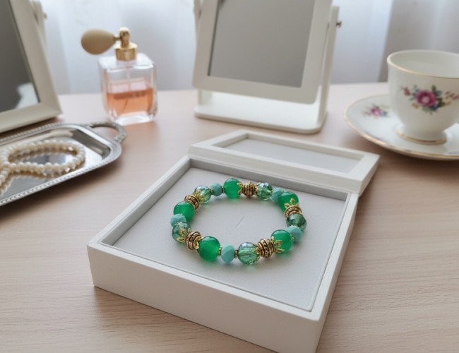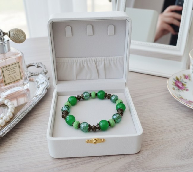 Bracelet fil élastique perles verre laqué et imitation jade vertes