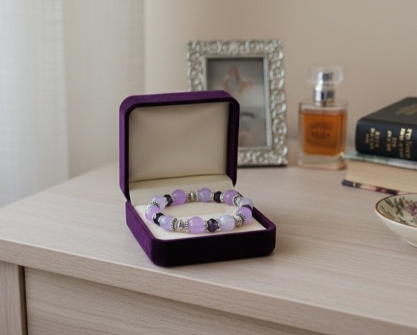 Bracelet fil élastique perles imitation jade et craquelé mauve