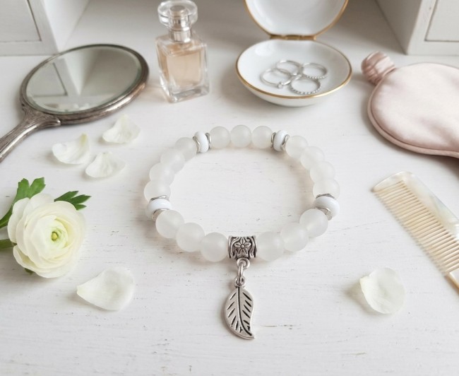 Bracelet fil élastique et perles en verre blanche et breloque feuille