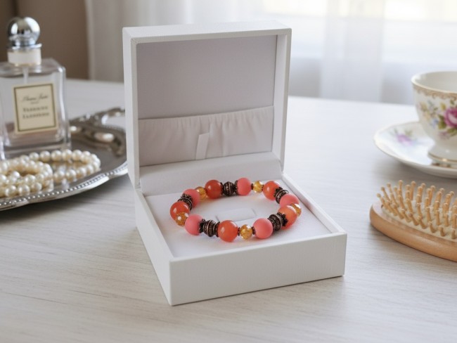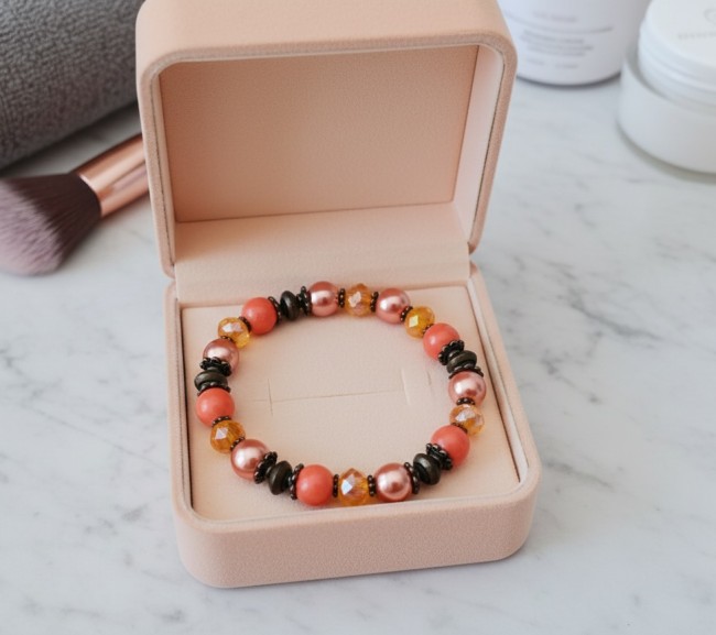 Bracelet fil élastique perles verre laqué et jade saumon orange