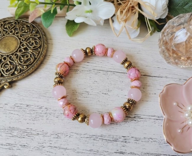 Bracelet fil élastique perles en verre imitation jade rose et craquelé