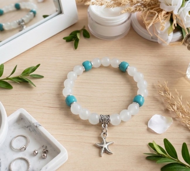 Bracelet fil élastique et perles en verre blanche et turquoise avec breloque étoile de mer