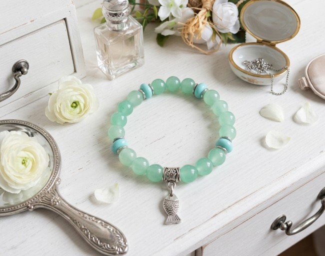 Bracelet perles en verre imitation jade jaune et breloque poisson