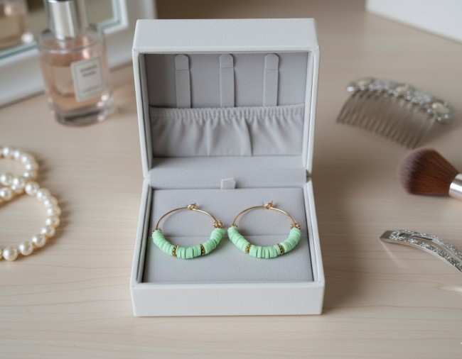 Kit de boucles d'oreilles créoles dorées acier inoxydable 25 mm et perles Heishi vert anis