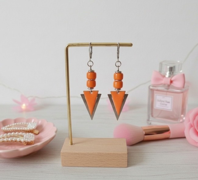 Boucles d'oreilles acier inoxydable pendentif triangle métal et émail couleur orange