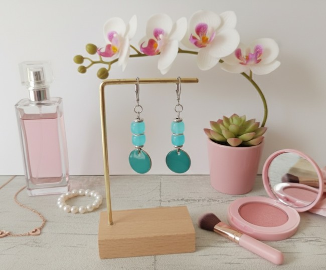 Boucles d'oreilles acier inoxydable, sequin métal et perles colonnes bleu vert