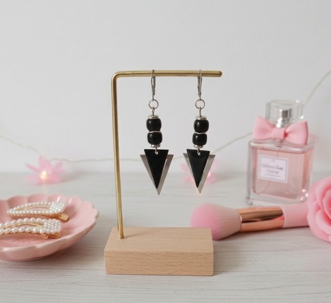 Boucles d'oreilles acier inoxydable pendentif triangle métal et émail couleur noir