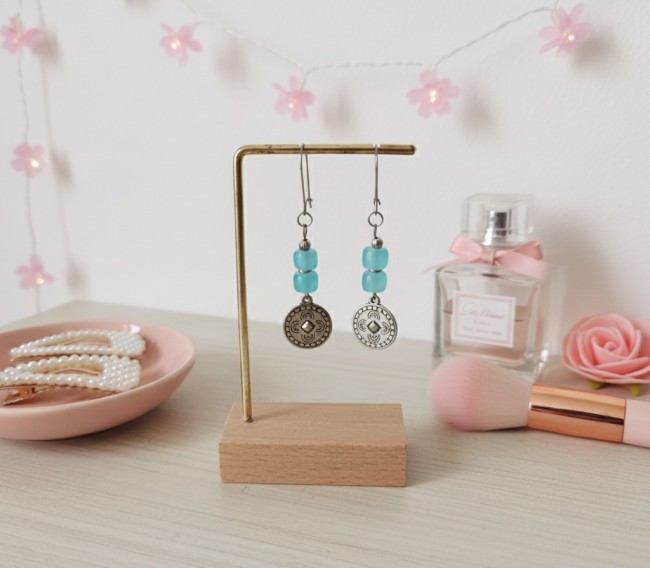 Boucles d'oreilles acier inoxydable, sequin métal et perles colonnes turquoise