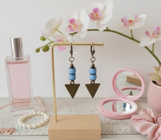 Boucles d'oreilles pendentif bronze et perles colonne bleues