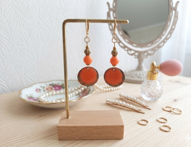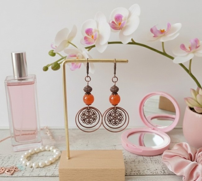 Boucles d'oreilles perles imitation jade orange et anneaux cuivre rouge