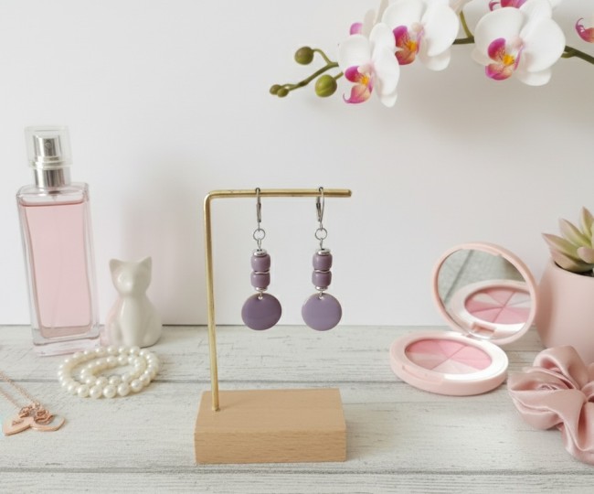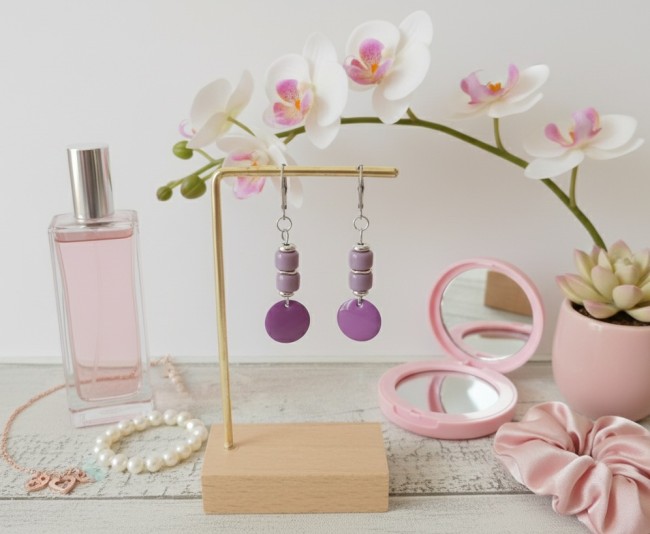 Boucles d'oreilles acier inoxydable, sequin métal et perles colonnes lilas