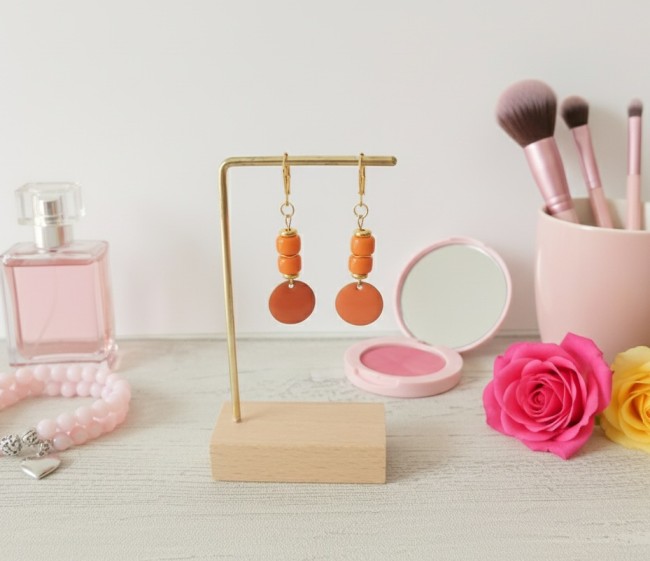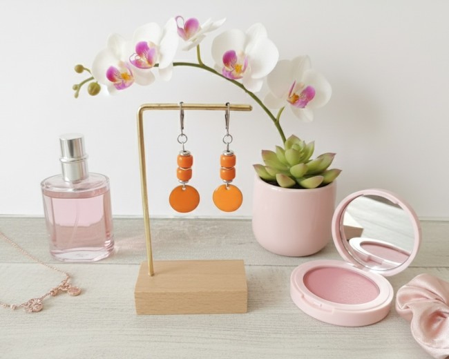 Boucles d'oreilles acier inoxydable, sequin métal et perles colonnes oranges
