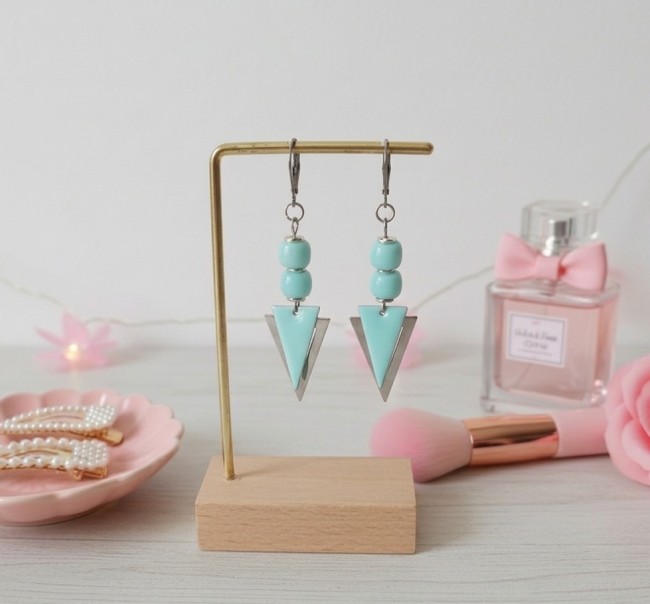 Boucles d'oreilles acier inoxydable et pendentif métal triangle et émail turquoise