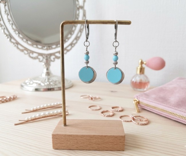 Boucles d'oreilles acier inoxydable argent mat et sequin fer bleu