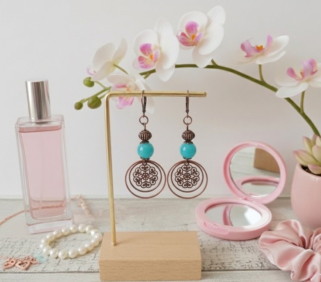 Boucles d'oreilles perles imitation jade turquoise et anneaux cuivre rouge