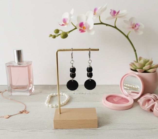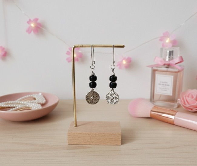 Boucles d'oreilles acier inoxydable, pendentif rond et perles colonnes noires