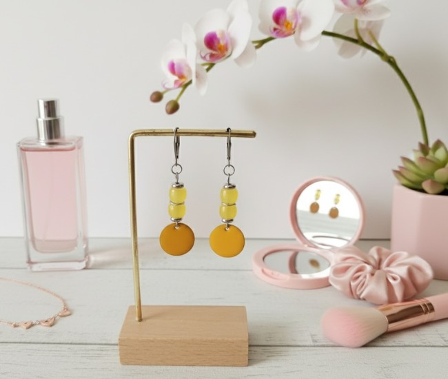 Kit boucles d'oreilles acier inoxydable et perles en verre moutarde