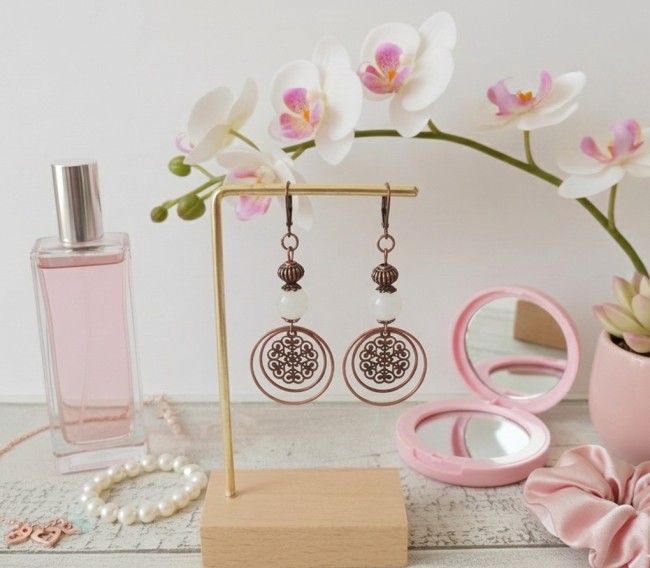 Boucles d'oreilles perles imitation jade blanche et anneaux cuivre rouge