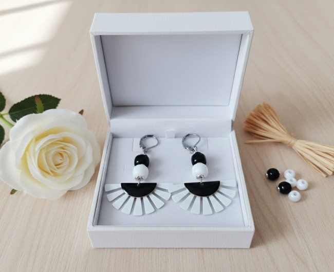 Boucles d'oreilles acier inoxydable éventail métal et émail blanc