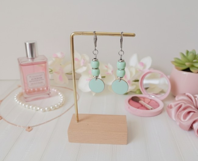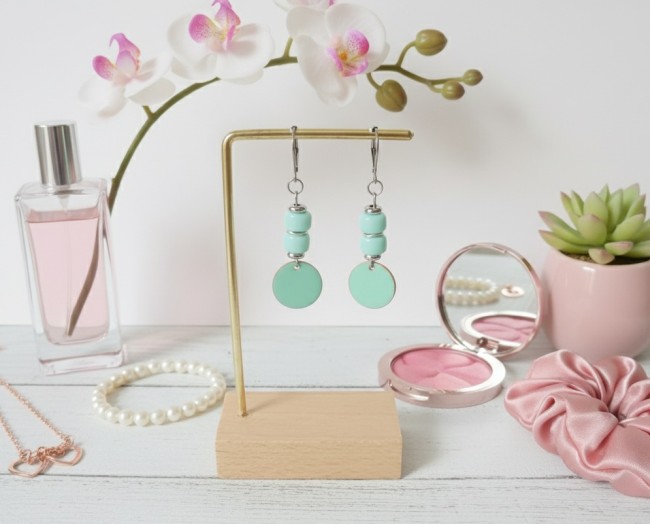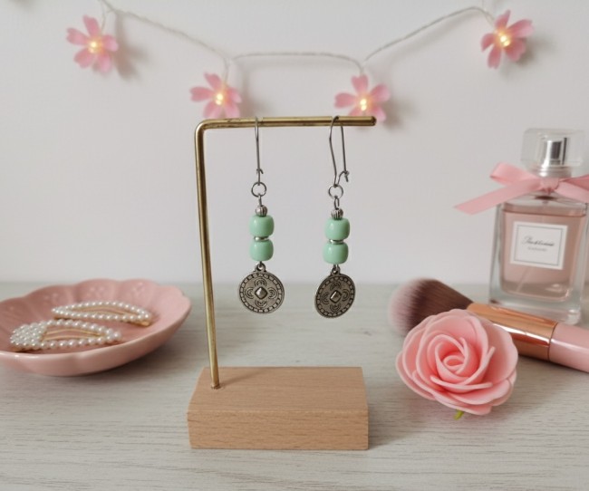 Boucles d'oreilles acier inoxydable, pendentif rond et perles colonnes vert d'eau