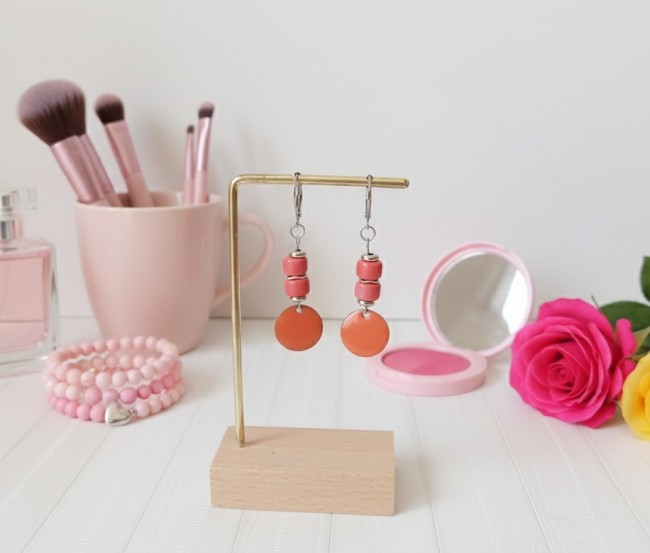 Boucles d'oreilles acier inoxydable et pendentif émail corail
