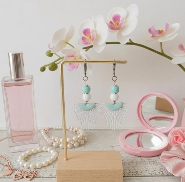 Boucles d'oreilles acier inoxydable et pendentif aile blanche sequin bleu vert