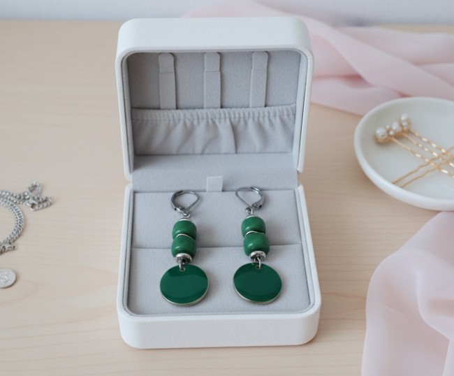 Boucles d'oreilles acier inoxydable et sequin émail vert foncé